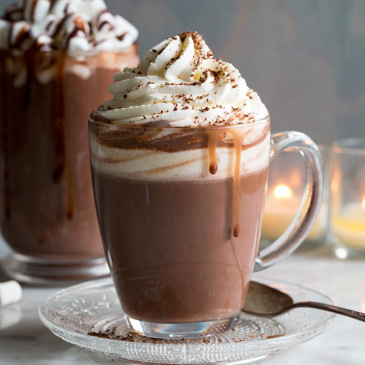 Delicious hot chocolate with a bit of caramel and whipped cream.