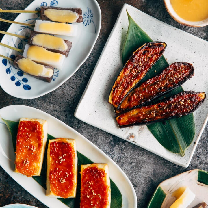 A three piece miso glazed dish of tofu, eggplant, and daikon.